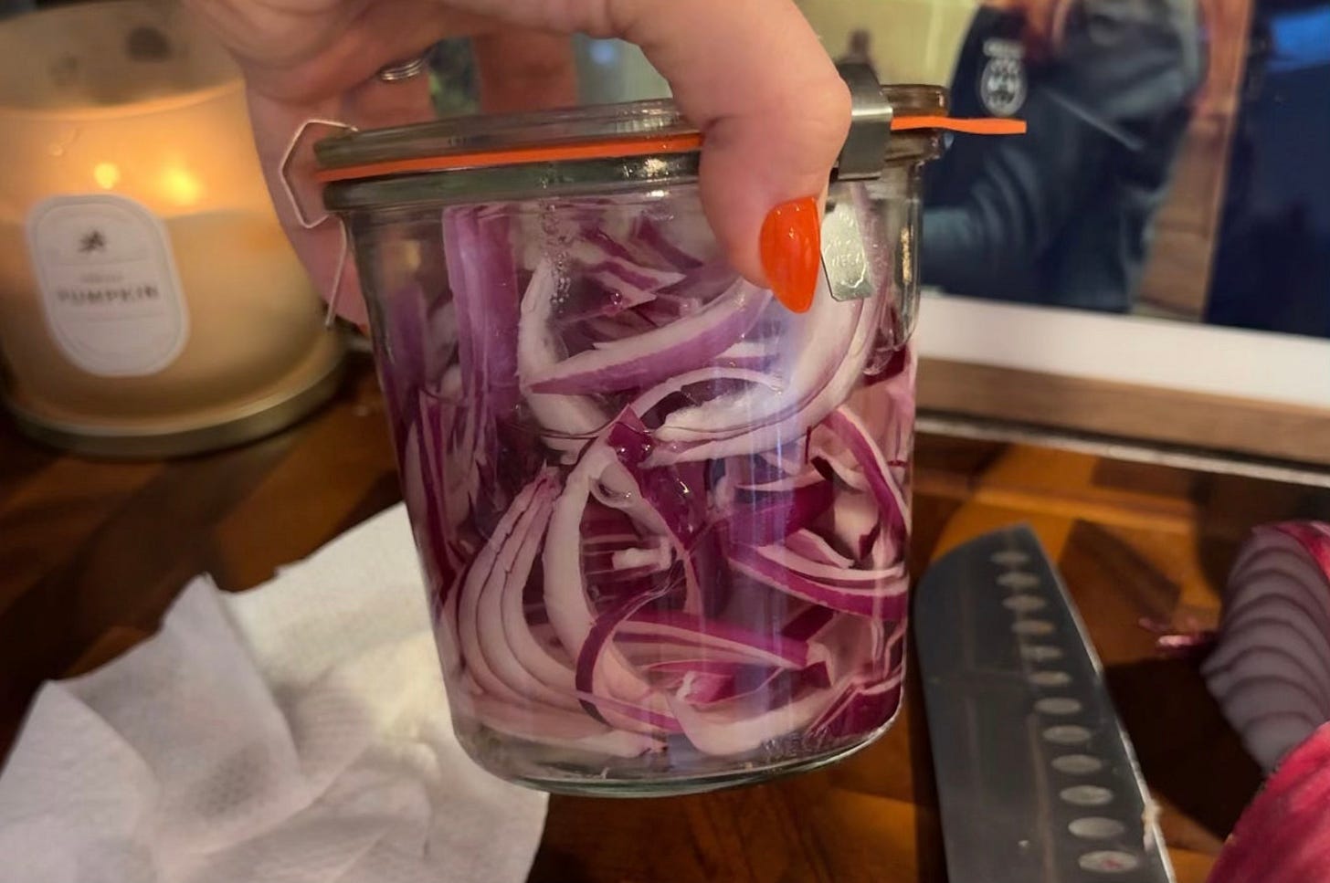 Thinly slice the red onion and place it in a glass jar or bowl.
